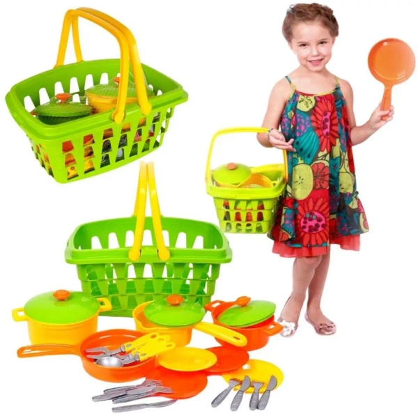 W skład zestawu kuchennego wchodzą różnorodne elementy, które umożliwiają symulację gotowania. Wśród nich znajdziemy: kosz, dwa garnki z pokrywkami, rondel z pokrywką, patelnię oraz różnego rodzaju akcesoria kuchenne, takie jak: łopatka, duży widelec, chochla, skimmer.