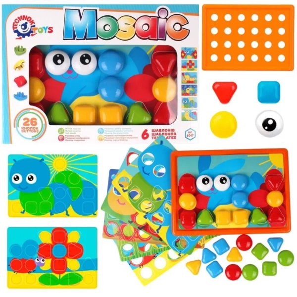 Zestaw "Mozaika TechnoK" to kreatywna zabawka dla dzieci, która pozwala na rozwijanie wyobraźni i umiejętności manualnych. W skład zestawu wchodzi łącznie 32 elementy, w tym 26 guzików oraz 6 specjalnych szablonów.