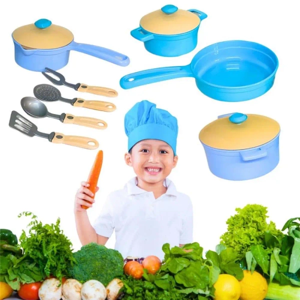 Prezentujemy zabawkowy komplet naczyń obiadowych, utrzymany w atrakcyjnej kolorystyce. Zestaw składa się z 11 części, w tym: dwóch garnków, patelni, rondla, trzech odpowiednich pokrywek, chochli, łyżki z cedzakiem, dużego widelca dla szefa kuchni oraz łopatki.