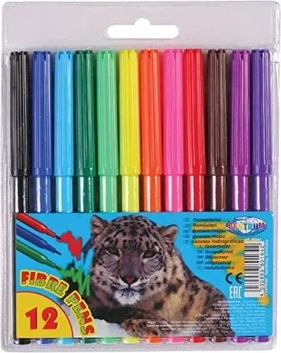 Zestaw flamastrów o intensywnych, żywych kolorach przechowywanych w przejrzystym, plastikowym etui. Tusz, z którego wykonane są flamastry, powstał na bazie wody. Skuwka na każdym flamastrowi zapewnia jego długotrwałą świeżość.
