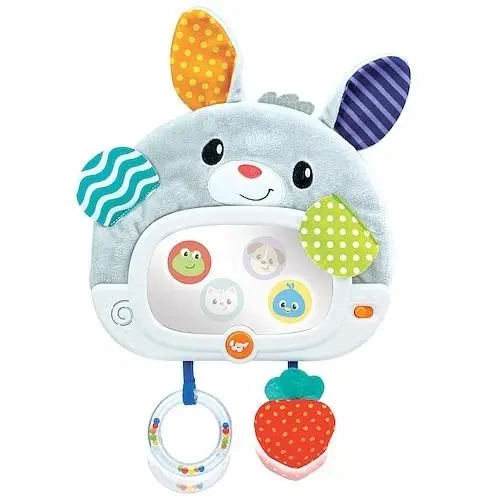 Zestaw zawiera baterie 3 x AAA, dzięki którym zabawka znacznie zyskuje na wrażeniach podczas zabawy. Króliczek zachwyci swoim uśmiechem i barwami, a wmontowane lusterko pozwoli maluchowi bawić się korzystając jednocześnie z własnego odbicia.
