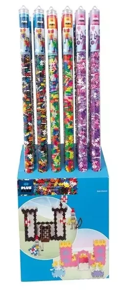 Display Plus-Plus z metrowymi tubami, który świetnie nadaje się do ekspozycji w sklepie. Zawiera 24 tuby z elementami w kolorach podstawowych, 8 neonowych oraz 4 pastelowe. Każda z tub zawiera 520 elementów.