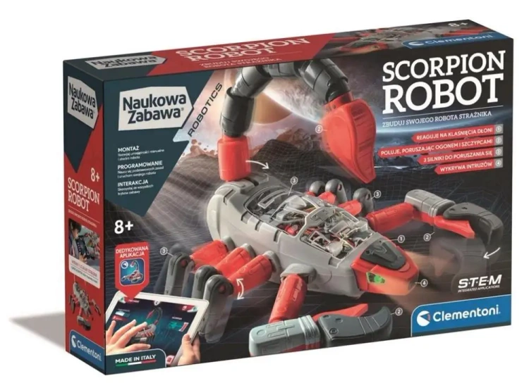 Uważaj, ponieważ ten nowoczesny robot od Clementoni może ukąsić! Czeka na Ciebie niezwykła zabawka, która zachowuje się jak żywy skorpion. Dzięki niemu dzieci oraz dorośli mogą cieszyć się oryginalnym produktem, który na pewno przyciągnie wzrok innych. Skorpion potrafi chodzić oraz poruszać swoimi szczypcami i ogonem, udając prawdziwego zwierzęcia.