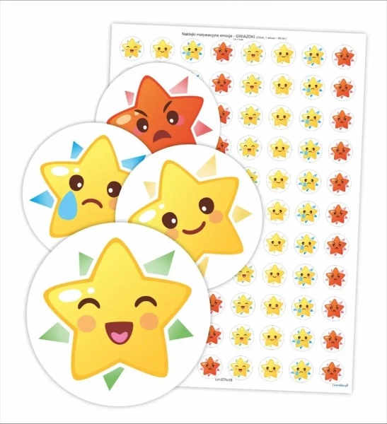 Te ciekawe naklejki w kształcie gwiazdek, o średnicy 20mm, dostępne w zestawie 88 sztuk, są idealne do motywowania dzieci. Prezentują różne nastroje i wyraziste kolory.