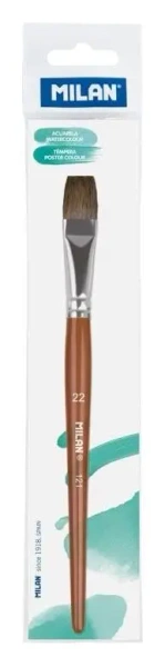 Płaski pędzel marki MILAN do prac szkolnych z serii 121 nr 22, charakteryzujący się krótkim trzonkiem z drewna. Składa się w 70% z naturalnego włosia koziego oraz 30% z włókien syntetycznych. Prezentuje się estetycznie dzięki brązowemu lakierowanemu wykończeniu, a także jest wyposażony w odporną na korozję aluminiową skuwkę, która nie jest spawana.