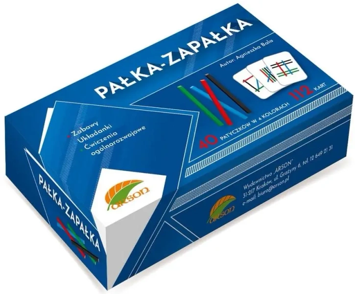 "PAŁKA ZAPAŁKA" to zbiór edukacyjnych kart, które mają na celu umożliwić dzieciom układanie patyczków zgodnie z wzorem podanym na karcie. Trudność zadania jest określana liczbą patyczków w danym wzorze.