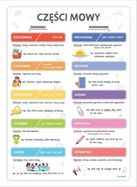Plakat to doskonała metoda na powtórzenie bądź utrwalenie fundamentalnych zasad i przykładów w kontekście Części Mowy.