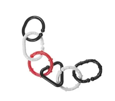 Ogniwa Tullo to wygodne akcesoria służące do łączenia i mocowania zabawek w łóżeczku, wózku czy na macie edukacyjnej. Stworzone z myślą o bezpieczeństwie i rozwoju niemowląt, cechują się czarno-białą kolorystyką, która doskonale stymuluje zmysł wzroku malucha. Ponadto, dzięki zróżnicowanym wypustkom, ogniwa te są odpowiednie do wspomagania integracji sensorycznej.