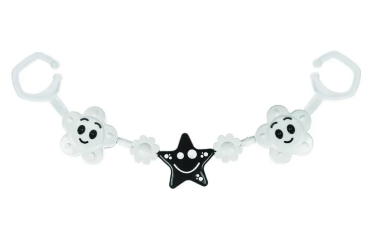 Radosne brzmienia grzechotki umilają dziecku każdy spacer. Czarno-białe kolory idealnie oddziałują na rozwój wzroku malucha, który w początkowym okresie jeszcze nie odróżnia kolorów.