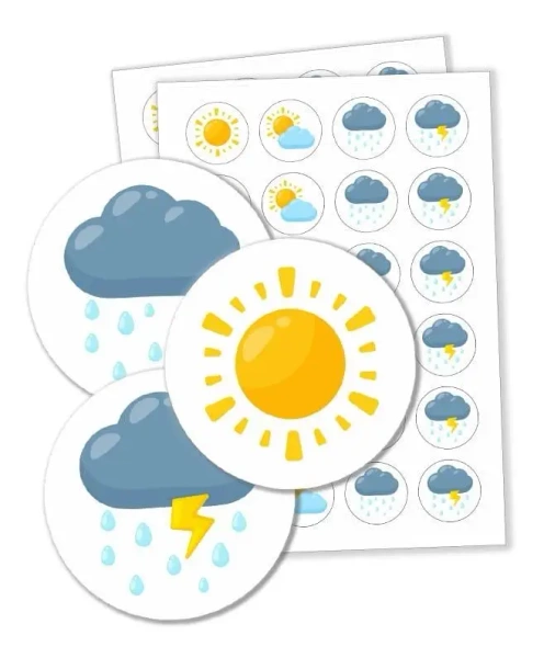 Znajdziesz tutaj: - 12 sztuk z motywem słońca - 12 sztuk z zachmurzonym słońcem - 12 sztuk z deszczową chmurką - 12 sztuk z burzową chmurą W sumie w zestawie otrzymasz aż 48 sztuk naklejek.Charakterystyka produktu