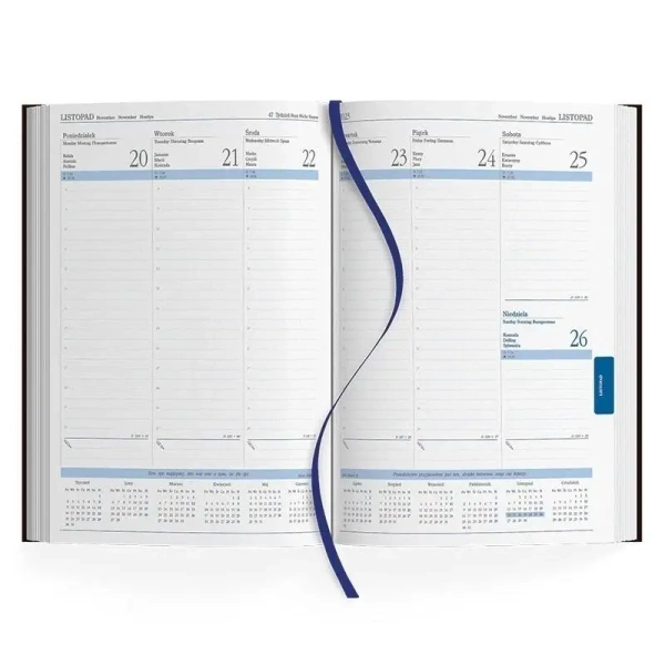 Prezentujemy Państwu atrakcyjny kalendarz na rok 2023 w formacie B5, o wymiarach 16,5 x 23,5 cm i liczący aż 144 strony. Kalendarz ten cechuje się wygodnym układem tygodniowym, rozłożonym na dwie strony po otwarciu, z nadrukowanymi rejestrami na każdej stronie.
