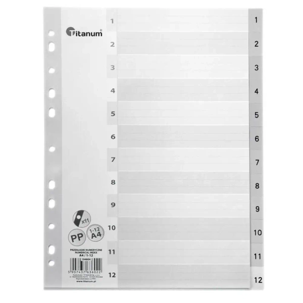 Przekładki A4 1-12 PP IN12 TITANUM wyposażone są w indeks numeryczny, co umożliwia sprawną organizację dokumentów według wybranej numeracji. W zestawie otrzymasz aż 12 kartek, dzięki którym łatwo przyporządkujesz zbiory różnorodnych papierów i wprowadzisz porządek w swoim biurze czy domowym archiwum.