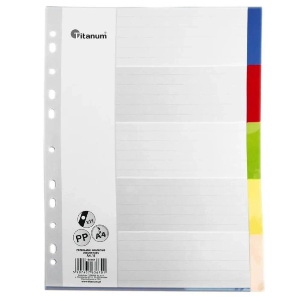 Kolorowe z czystymi indeksami, przełkładki A4 Titanum są dostępne w 5 różnych kolorach. To umożliwia łatwe rozróżnienie między poszczególnymi sekcjami segregatora, a jednocześnie sprawia, że aranżacja biurka staje się bardziej atrakcyjna.