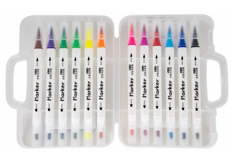 Prezentujemy Państwu komplet 12 markerów dwustronnych, zamkniętych w efektownym plastikowym opakowaniu z praktycznym uchwytem. Wyróżniają się one nie tylko ponętnym designem, ale przede wszystkim różnorodnością jaskrawych, soczystych barw. Z jednej strony markery mają końcówkę o grubości 3,2 mm, imitującą pędzel, natomiast z drugiej strony końcówka jest ścięta i ma 3,5 mm.