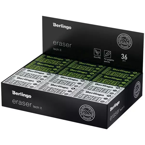 Prostokątne gumki "Tech it" od firmy Berlingo produkowane są z przyjaznego środowisku EKO-PVC, są całkowicie bezpieczne i niezawierające toksyn. Wykazują doskonałą skuteczność w usuwaniu linii wykonanych ołówkiem czarno-grafitowym, nie pozostawiając przy tym żadnych śladów czy brudnych smug. Dodatkowym atutem jest to, że nie uszkadzają one papieru.