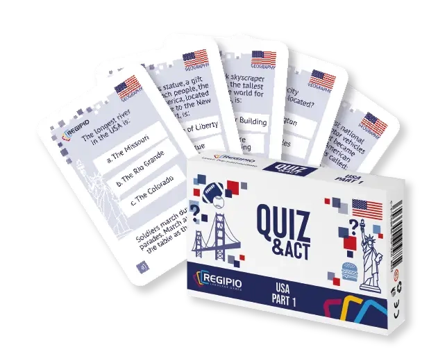 QUIZ & ACT USA to 50 kart dydaktycznych z pytaniami dotyczącymi kultury i historii Stanów Zjednoczonych.
