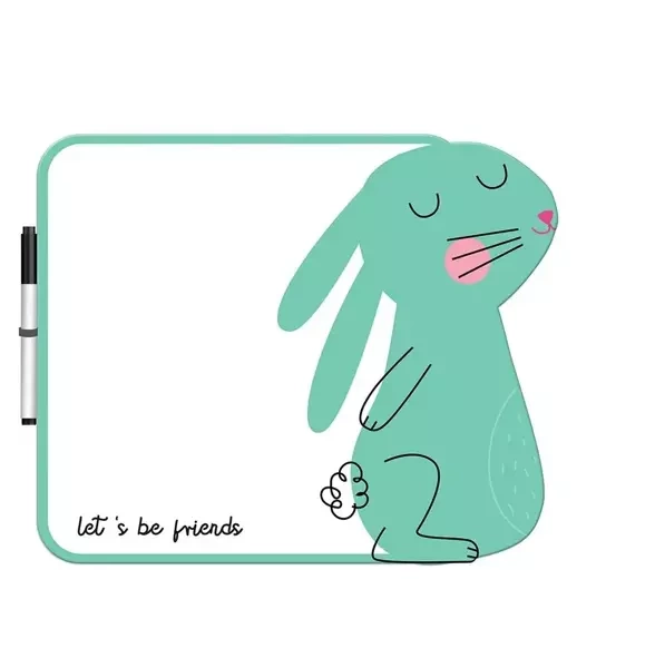 Tablica suchościeralna o wymiarach 28 x 35 cm z wizerunkiem uroczego królika to doskonały produkt dla najmłodszych, który pozwoli im na pisanie w nieskończoność swoich myśli, rysowanie obrazków, a także ćwiczenie zdolności manualnych. Zestaw zawiera również marker suchościeralny z gąbką, który umożliwia łatwe zmywanie narysowanych wcześniej treści i korzystanie z tablicy wielokrotnie.