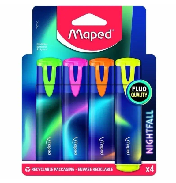 Zakreślacze z serii Nightfall dostępne są w ekologicznym, kartonowym etui, które można poddać recyklingowi. W jednym opakowaniu znajdują się cztery zakreślacze w różnych kolorach. Każda jednostka sprzedaży to jedno etui.