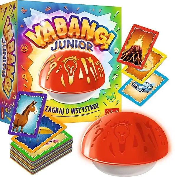 Vabang Junior to ekscytująca gra towarzyska, w której każdy gracz musi działać najszybciej jak tylko potrafi, ponieważ wszyscy uczestnicy grają równocześnie. Odczuj emocje porównywalne z tymi jakie towarzyszą uczestnikom teleturnieju! Twoje zadanie to jak najszybciej zobaczyć obrazek na karcie i nacisnąć przycisk. Gdy to zrobisz, przycisk zacznie świecić i grać melodię. Miej na uwadze, że odpowiedź innych graczy może pozbawić Cię punktu. Na wymyślenie swojego skojarzenia masz ograniczony czas, więc musisz działać błyskawicznie.Z tą grą będziesz mógł rozwijać swoją spostrzegawczość, kreatywność i zdolność do szybkiego podejmowania decyzji! Podejmuj niekonwencjonalne akcje, zaskakuj przeciwników. Zagraj wszystko na Vabang!
