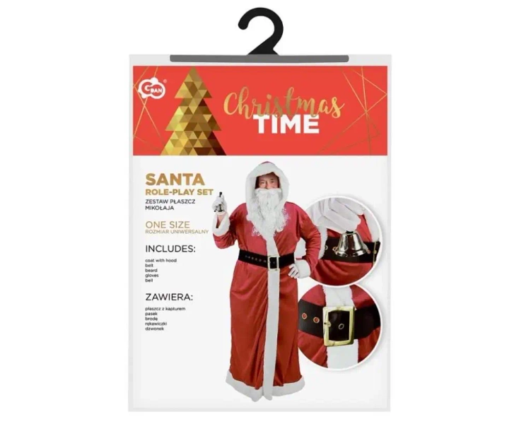 Wyjątkowy, welurowy kostium Mikołaja to doskonały pomysł na przebranie na świąteczny czas. W skład zestawu wchodzą: płaszcz z kapturem, pasek, broda, rękawiczki oraz dzwonek. Co istotne, kostium występuje w uniwersalnym rozmiarze dostosowanym do różnych sylwetek, dzięki czemu pasuje na każdego miłośnika magii tego wyjątkowego okresu.