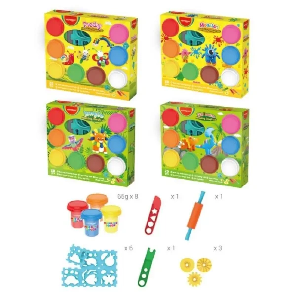 Produkt prezentowany stanowi idealną kombinację 8 różnokolorowych kostek ciastoliny, uzupełnioną o zestaw narzędzi do tworzenia. Dołączony do zestawu wałek, nożyk i 3 geometryczne kółka służące do cięcia, jak również 6 kwadratowych foremek zwiększają możliwości zabawy.
