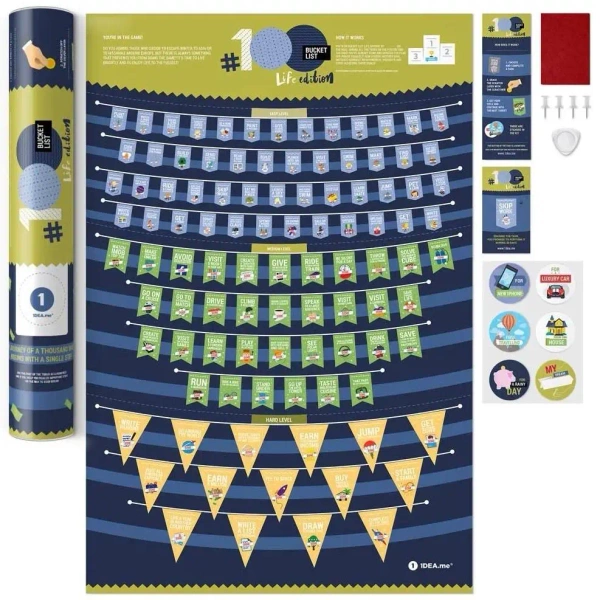 1DEA.me #BUCKETLIST Life Edition to interaktywny afisz stworzony z myślą o każdym, kto chce w pełni przeżywać swoje życie. To lista 100 rzeczy, które powinno się spełnić i doświadczyć. Realizuj sny, wypełniaj zadania i zdrapuj pola, aby śledzić swoje postępy.