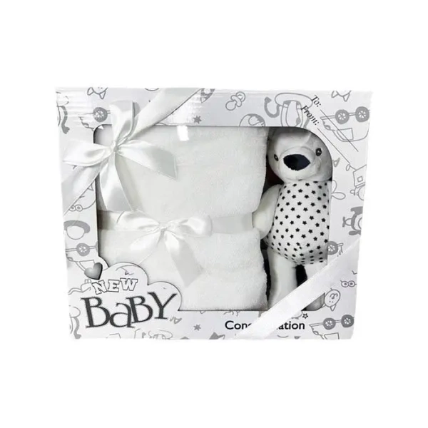 W zestawie znajdują się kocyk oraz grzechotka. Wszystko starannie zapakowane, gotowe na prezent dla najmłodszych. Wyjątkowość tego zestawu sprawia, że będzie on idealną propozycją na wszystkie okazje.