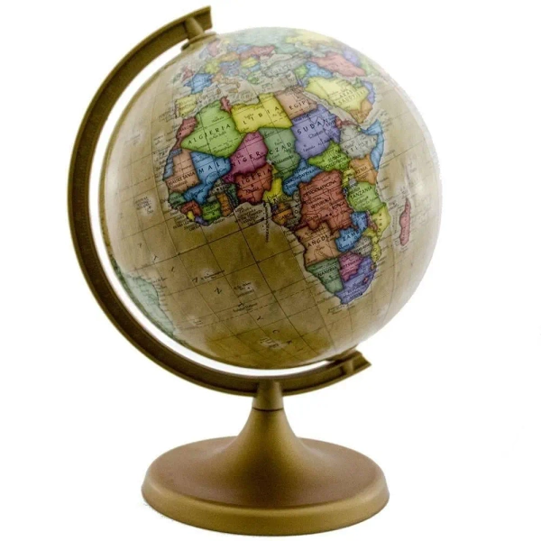 Globus o średnicy 160mm przedstawiający polityczną mapę świata, stworzony z materiałów takich jak plastikowa cięciwa oraz stopka. Wykonany w stylu retro, pokryty folią termokurczliwą dla trwałości i estetyki.