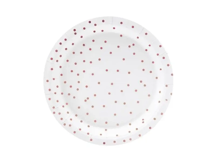 Prezentujemy papierowe talerzyki białe ozdobione wzorem delikatnych kropek w odcieniu różowego złota. Wymiary tych wykwintnych talerzyków to około 18 cm średnicy. W opakowaniu znajduje się 6 sztuk.