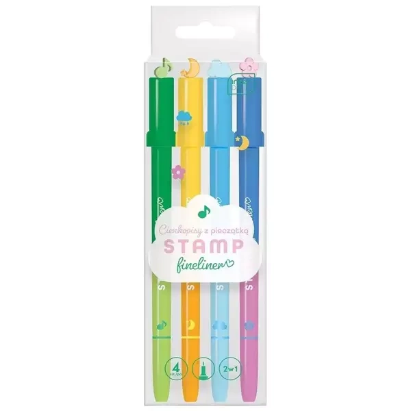 Interdruk prezentuje zestaw 4 kolorowych cienkopisów 2w1, uzupełnionych o pieczątkę na ich końcu. Komplet zapakowany jest w estetyczne, przezroczyste etui.