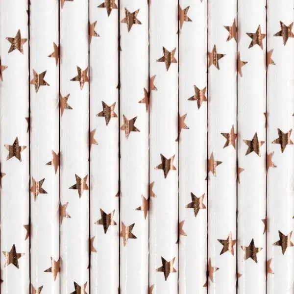 Papierowe słomki utrzymane są w ciepłych barwach białego i jasno różowego złota. Ich powierzchnię zdobią metalizowane gwiazdki, które nadają im niepowtarzalny wygląd. Długość słomek wynosi mniej więcej 19.5 cm, co sprawia, że są one praktyczne i wygodne w użyciu. Produkt zgodny z przepisami Unii Europejskiej nie jest jednak dostępny dla klientów z Niemiec, ze względu na lokalne przepisy prawne tego kraju. Oferta obejmuje 10 sztuk słomek w jednym opakowaniu.