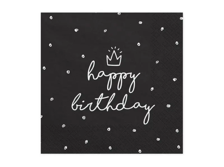 Rozważasz udekorowanie stołu na urodziny w wyjątkowy sposób? Prezentujemy Ci trójwarstwowe serwetki Happy Birthday zaprojektowane w eleganckim czarnym kolorze z białym nadrukiem. Mierzą one 33 x 33 cm, co sprawia, że są idealne do użycia na każdym stole.
