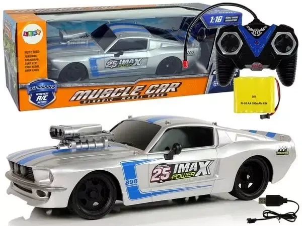 Auto sportowe sterowane na pilota w skali 1:16, kolor srebrny z niebieskimi pasami