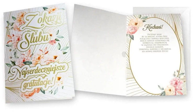 W środku każdej kartki znajdują się pięknie sformułowane życzenia, a dołączona koperta gwarantuje pełen zestaw do przekazania wyjątkowych życzeń młodej parze. Dzięki temu, że karnet jest w pełni gotowy do wręczenia, to idealny sposób na wyrażenie najserdeczniejszych życzeń na nową drogę życia, którą para młoda właśnie rozpoczyna.