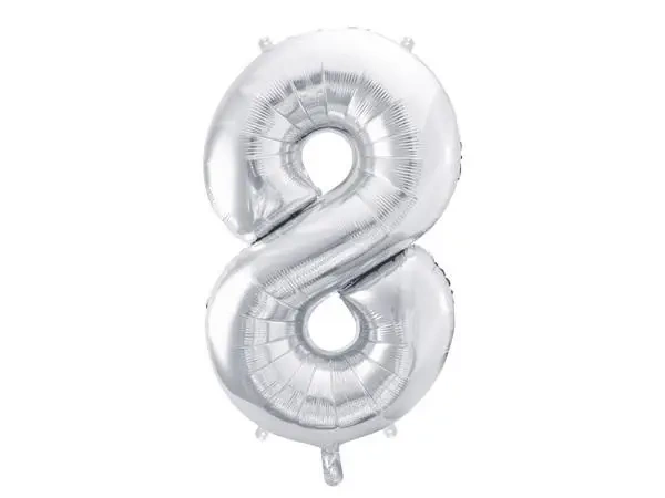 Niesamowity balon foliowy w kształcie cyfry "8" o metalizowanym, srebrnym wykończeniu. Idealna dekoracja na różnego rodzaju imprezy i uroczystości. Przed napompowaniem balon ma wymiary około 100 cm (39"), natomiast po napompowaniu osiąga około 86 cm (34").