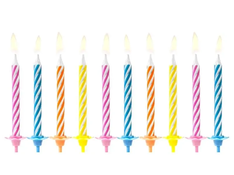 Prezentujemy zestaw urodzinowych świeczek w różnorodnych kolorach. Każda świeczka ma długość około 6 cm. W pakiecie znajduje się 10 sztuk świeczek wraz z 10 podstawkami. Całość dostępna w opakowaniu jednostkowym (1 op./10 szt.).
