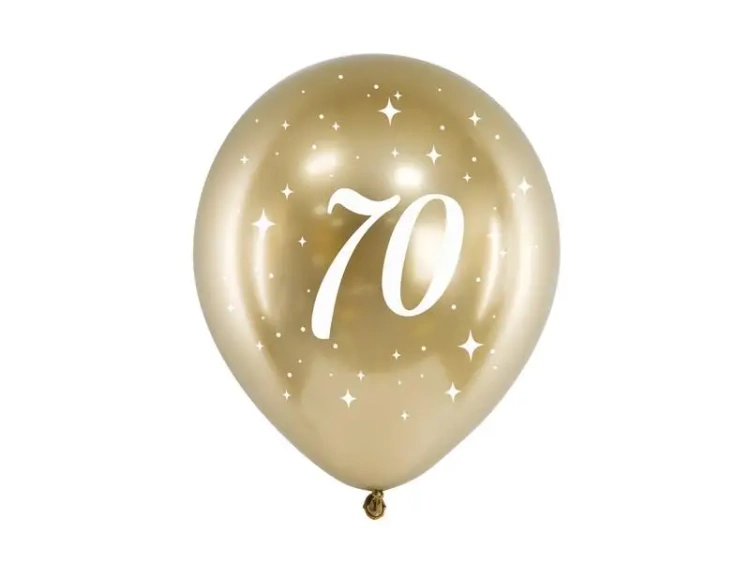 Złote balony Glossy z eleganckim białym nadrukiem "70" to idealny dodatek na uroczystość z okazji 70 urodzin. Oferowany zestaw zawiera 6 balonów o średnicy 30 cm każdy, dzięki czemu można udekorować nimi zarówno wewnętrzną, jak i zewnętrzną przestrzeń przyjęcia.