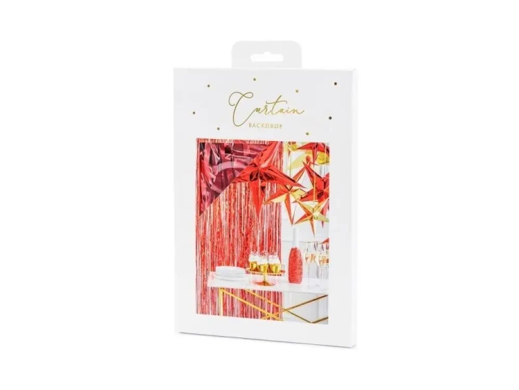 Elegancka Kurtyna marki PartyDeco w zjawiskowym kolorze czerwonym. Jej szerokość wynosi około 90 centymetrów, a wysokość to mniej więcej 250 centymetrów, co sprawia, że jest idealnym elementem dekoracji sali na różne okazje.