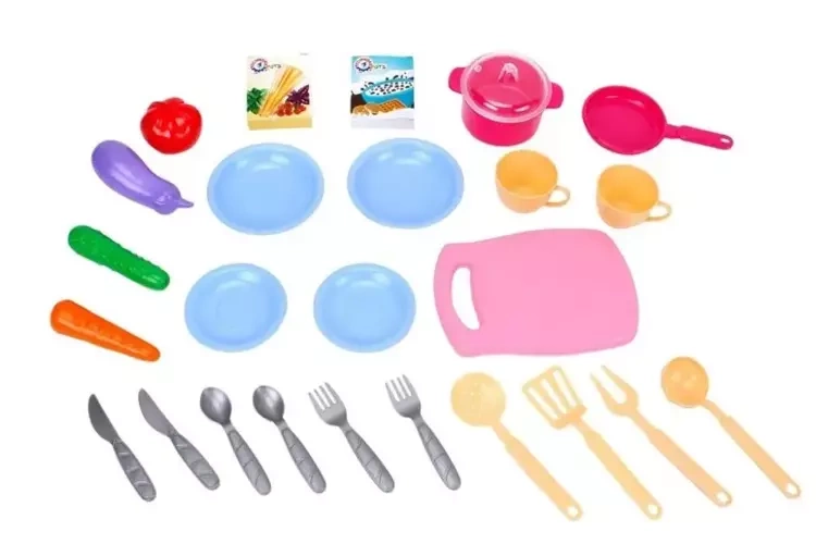 W komplecie znajdują się: blat ze zlewem i kranem, deska kuchenna, patelnia z pokrywką, patelnia, łyżki - 2 szt., widelce - 2 szt., noże - 2 szt., talerze - 2 szt., duży do, skimmer, łopatka, gałka, ogórek, marchewka, bakłażan, pomidor, pudełka - 2 szt.