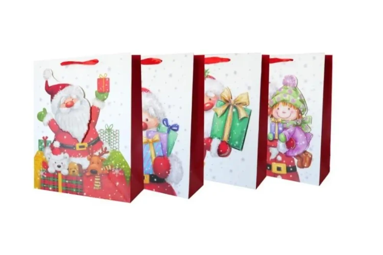 Prezentowany produkt to świąteczna torebka upominkowa z brokatowym wykończeniem, dostępna w różnorodności wzorów. Wysyłka wzorów odbywa się losowo, co sprawia, że każde zamówienie jest niepowtarzalne. Oferowana cena dotyczy jednej sztuki.