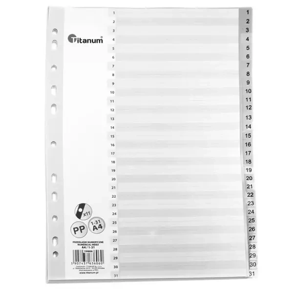 Przekładki A4 Titanium to doskonałe rozwiązanie do segregacji i porządkowania dokumentów. Wykonane są z trwałego polipropylenu o elastycznych właściwościach, dzięki czemu są odporne na codzienne użytkowanie. 31 kartek przekładek z numeracją od 1 do 31 sprawia, że można je łatwo dostosować do indywidualnych potrzeb organizowania dokumentów.