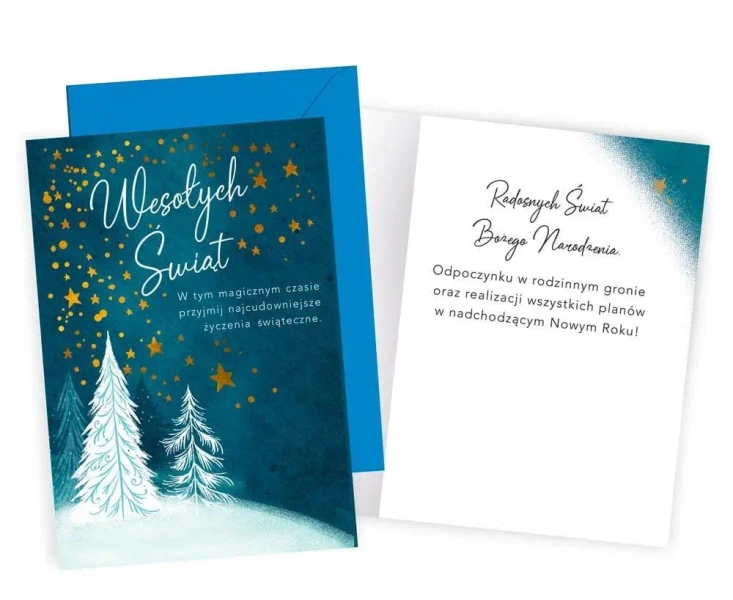 Ta estetycznie zaprojektowana kartka o wielkości B6, zazwyczaj ozdobiona metalizowaną folią lub brokatem, w zależności od konkretnego projektu. W jej wnętrzu znajdują się kolorowe życzenia, a do kompletu dołączona jest również dopasowana koperta. Wymiary karnetu po złożeniu wynoszą 11,7 x 16,6 cm.