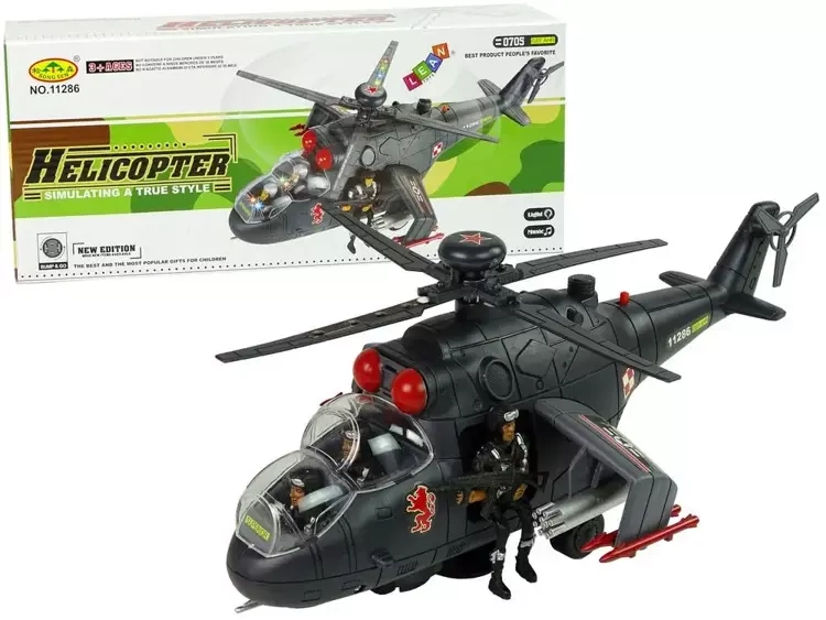 Zabawka wykonana jest z solidnego, atestowanego plastiku. Oszałamiające wrażenie robią obrotowe skrzydła z diodami LED, które świecą w różnych kolorach. Wnętrze kokpitu mieści figurki żołnierzy. Całość zestawu zawiera trzy takie figurki - jedna z nich jest umieszczona na boku helikoptera tuż przy karabinie, gotowa na misję.