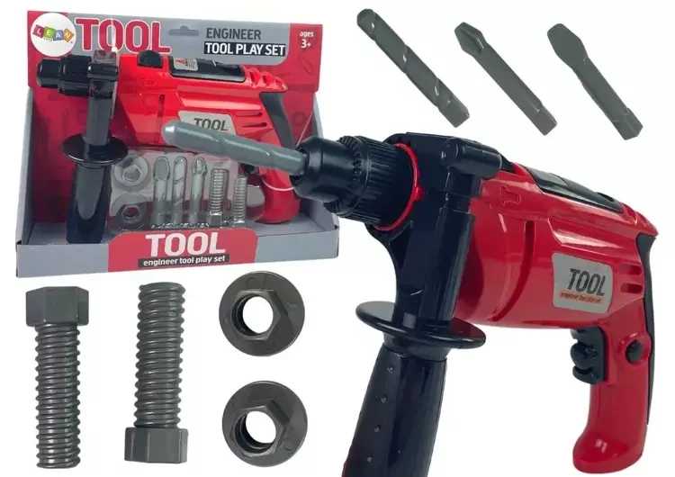 Kolorystyka zabawki jest typowa dla narzędzi – czerwień przeplata się ze szarością. Pakiet zawiera wiertarkę, śrubki i nakrętki oraz wiertła, co umożliwia niekończącą się zabawę z kręceniem i odkręcaniem śrubek. Wymienne wiertła są dodatkowym atutem, umilającym czas spędzony na zabawie.