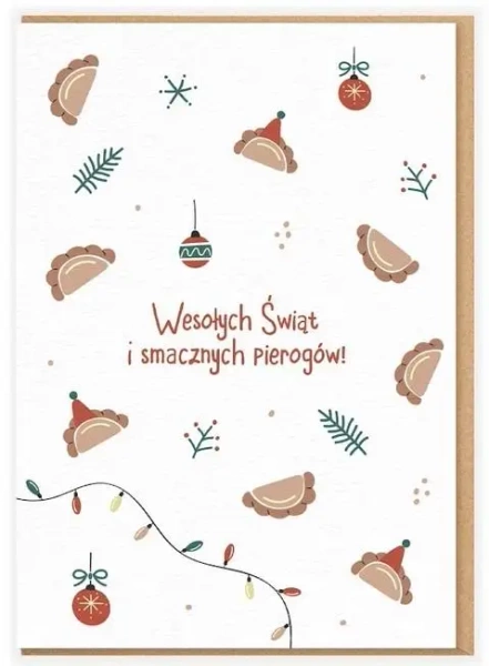 Boże Narodzenie w Polsce po prostu nie istnieje bez tradycyjnych pierogów! Czy to ruskie, z kapustą i grzybami, czy ze śliwką suszoną, pierogi są symbolem tego, co polska kuchnia ma najlepszego do zaoferowania. Dlatego karnet z życzeniami Wesołych Świąt i Smacznych Pierogów to doskonały dodatek do gwiazdkowego prezentu dla każdego wielbiciela naszej rodzimej kulinarii, zwłaszcza, gdy nie może się obejść bez pierogów i dań wigilijnych.