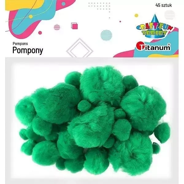 Pakiet zawiera 45 akrylowych pomponów w żywej, zielonej barwie. Puszki są różnej wielkości, co czyni je świetnym materiałem do rękodzieła i tworzenia plastycznych prac.