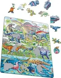 Rozmiar gotowego obrazu: 28 x 36 cm. Przedział wiekowy: 5+ Puzzle Larsen to wyróżniające się na rynku niepowtarzalnymi elementami. Produkowane w Norwegii, charakteryzują się starannie dobranymi obrazkami, które zadowolą dzieci w każdym wieku oraz wysoką jakością wykonania. Są nie tylko dobrą zabawką, ale również źródłem wiedzy dla dzieci. Zamierz w fascynującą podróż do czasów, gdy dinozaury dominowały na Ziemi, a klimat był ciepły, a morza płytkie. Na ilustracji widzimy różowego pteranodona, unoszącego się wysoko nad groźnym giganotozaurem. Ten był nawet większy od tyranozaura rex, który na tym obrazie wygląda jakby miał trochę ochłodzenia, stojąc w wodzie po kolana. Natomiast barionyks zdaje się być w trakcie posiłku - trzyma w pysku rybę, który ma kształt przypominający pysk krokodyla - co jest wyjątkowo praktyczne podczas łowienia ryb. W dolnym, lewym rogu obrazka pływa dakozaury, którego możemy nazwać dalekim kuzynem dzisiejszych krokodyli. Na samym dole widzimy niebiesko-żółtą dunkleosteusa, który według szacunków mógł osiągać ponad 8 metrów długości. Obraz składa się z 70 elementów, z których wiele ma specyficzne kształty nawiązujące do ukazanych dinozaurów, puzzle są stworzone z myślą o starszych dzieciach, które chcą połączyć zabawę z nauką.EAN: 7023852132104