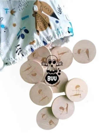 Ruchy! to zestaw 15 drewnianych krążków z różnymi ćwiczeniami gimnastycznymi, inspirowanymi pozycjami jogi. Pozwala on dzieciom bawić się na wiele różnych sposobów, ucząc ich jednocześnie różnorodnych ruchów i pracując nad ich koordynacją: