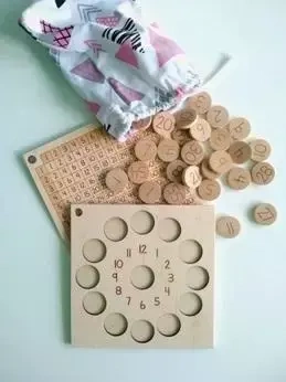 Tabliczka kontrolna powinna być przewrócona, żeby dziecko nie miało dostępu do gotowego rozwiązania! Powinno ono zerknąć na nią dopiero po skończeniu zadania. Na centralnym miejscu na kole mnożenia umieszczamy jeden z krążków z liczbą od 1 do 12 - jest to jeden z elementów naszego działania. Drugim elementem jest liczba wygrawerowana na kole. W otworach bocznych umieszczamy krążki z wynikami (iloczynami) i następnie sprawdzamy je tablicą kontrolną, ewentualnie poprawiając błędy.