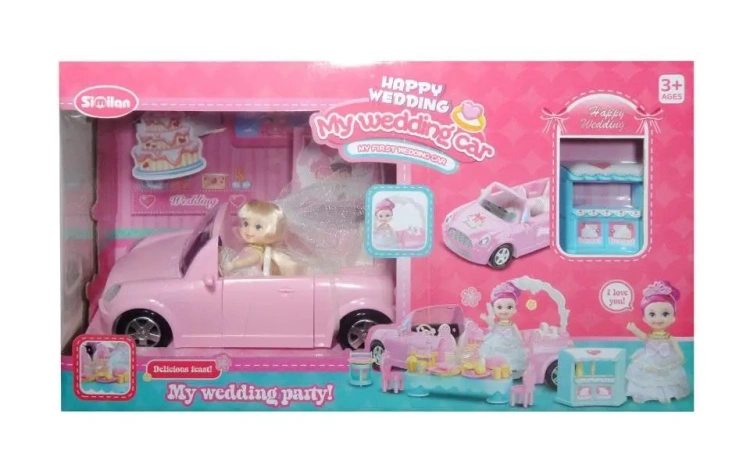 Urocze plastikowe auto z laleczką w sukni ślubnej